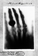 Laquelle est un peu le fruit du hasard. Si c'est en effet un physicien aguerri d'une cinquantaine d'années que nous retrouvons en cette soirée du 8 novembre 1895 dans une chambre noire, il cherche alors à élucider la nature de l’électricité. Dans cette optique, il étudie la lumière fluorescente émise par le passage d’un courant électrique dans un "tube de Crookes", une ampoule contenant un gaz à basse pression. Il observe alors un phénomène de fluorescence de la plaque photographique placée à distance du tube, pourtant recouvert de carton noir, et constate que cette manifestation persiste s’il interpose des objets entre le tube et la plaque. Il réalise ensuite l'expérience avec la main de son épouse et remarque avec stupéfaction que l'image qui apparaît est celle des os de cette dernière, son alliance étant discernable sur le film. Il en déduit qu’un rayonnement invisible d’origine inconnue est émis et lui donne donc le nom de rayons X, cette lettre servant à nommer une inconnue en mathématiques.